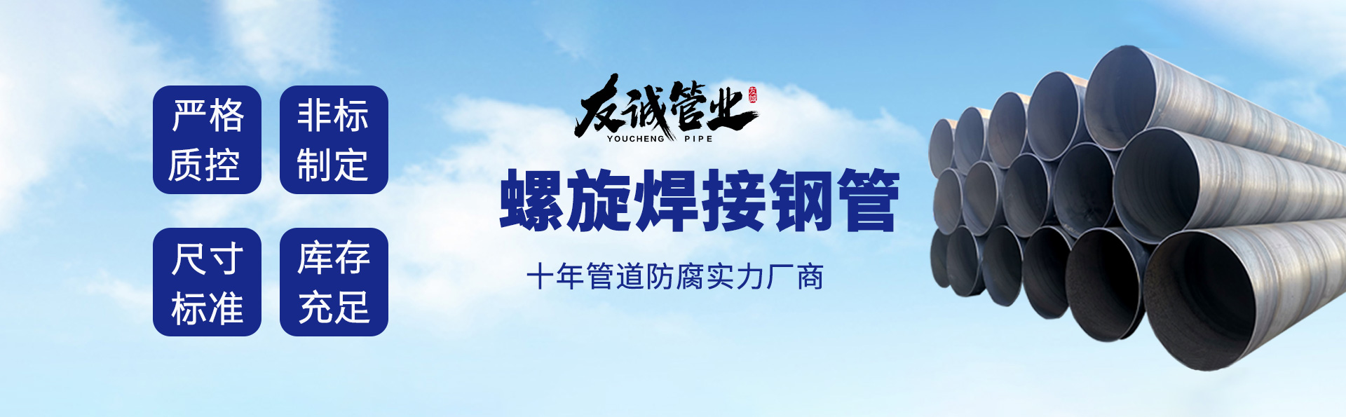 滄州友誠(chéng)管業(yè)有限公司是一家專業(yè)從事生產(chǎn)防腐涂塑管道及管件于一體的大型企業(yè)。公司注冊(cè)資金8600萬元,位于中國(guó)管道生產(chǎn)基地—河北鹽山縣,近靠京滬高速、榮烏高速、黃石高速30公里,高鐵滄州西站40公里,天津國(guó)際機(jī)場(chǎng)、濟(jì)南遙墻機(jī)場(chǎng)150公里,為客戶來訪及業(yè)務(wù)發(fā)展提供了便利的交通條件。        鋼管系列:螺旋鋼管、無縫鋼管、ERW直縫焊管、JCOE埋弧焊直縫鋼管、熱鍍鋅鋼管。        涂塑系列:內(nèi)外涂塑鋼管、涂塑復(fù)合鋼…… 了解更多